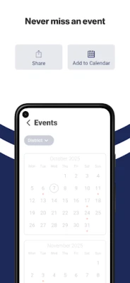 NEVER MISS AN EVENT The event section shows a list of events throughout the district. Users can add an event to their calendar to share the event with friends and family with one tap.
