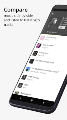 - Compare tracks side-by-side and listen to full‐length tracks, streamed through YouTube (where available).